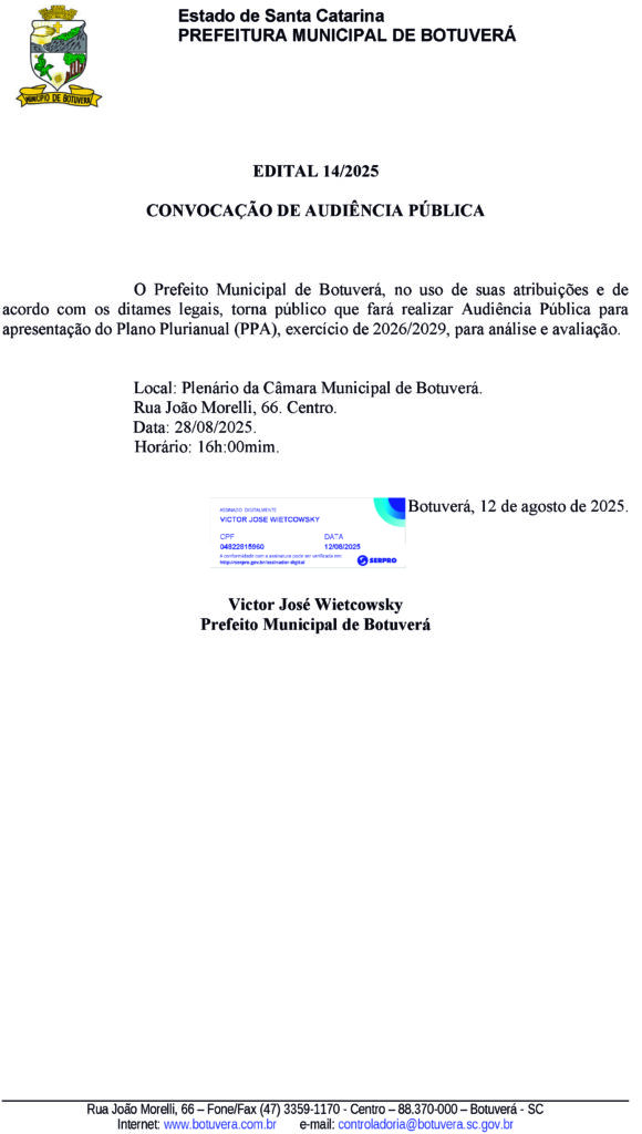 Informamos, que em virtude de manutenção do plenário da Câmara Municipal, que a AUDIÊNCIA PÚBLICA para apresentação do PPA 2026/2029, marcada para àquele local, em data de hoje 28/08/2026 às 16:00 horas, será transferida para a SALA DE REUNIÕES DA PREFEITURA MUNICIPAL, mantendo-se a mesma data e horário, ou seja 28/08 às 16:00 horas.