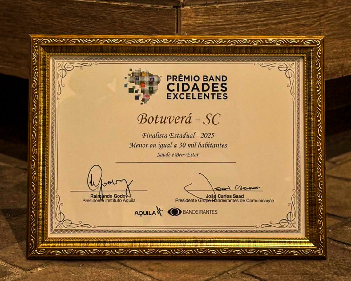 Botuverá novamente se destaca entre os municípios catarinenses que apresentam as melhores práticas de gestão pública. O município foi reconhecido como finalista do Prêmio Band Cidades Excelentes 2025, promovido pela TV Barriga Verde (TVBV) em parceria com o Instituto Áquila e o Grupo Bandeirantes. A cerimônia, realizada em Florianópolis, premiou iniciativas que alcançaram os melhores indicadores com base no IGMA – Índice de Gestão Municipal Aquila, metodologia que avalia eficiência, qualidade dos serviços, inovação e desenvolvimento sustentável.